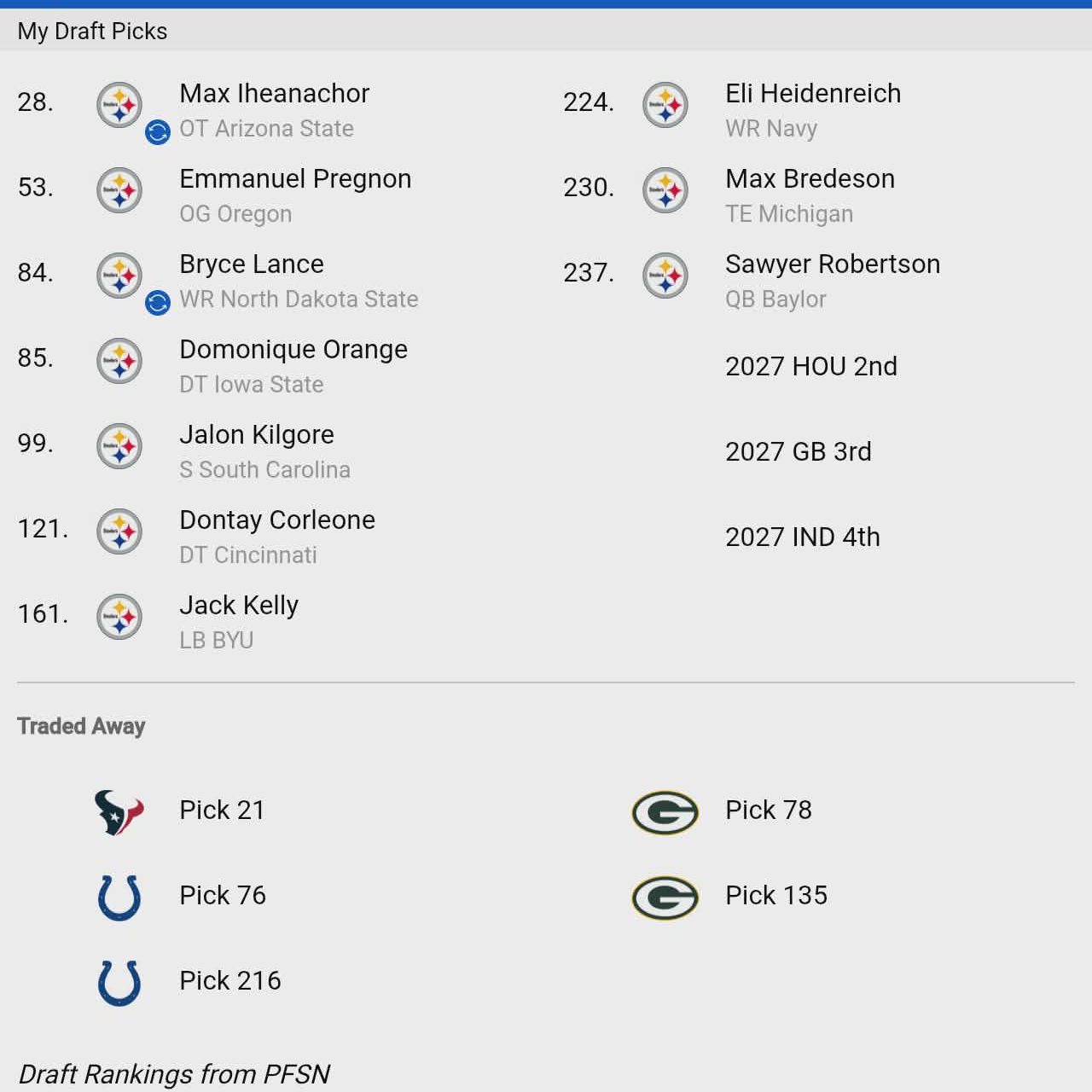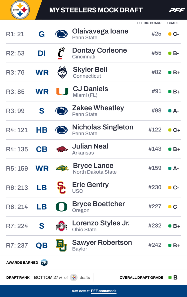 Finally, in the third round we are able to land two receivers who should see the field early and often in Mike McCarthy's new offensive system and provide much needed help opposite DK Metcalf, giving the Steelers the dynamic receiving corps they've been lacking in recent seasons. Bell brings elite separation ability and route-running precision, while Daniels offers explosive playmaking capability and contested-catch prowess that should translate immediately to the NFL level. Both prospects fill critical needs in the passing game and represent excellent value at this stage of the draft.