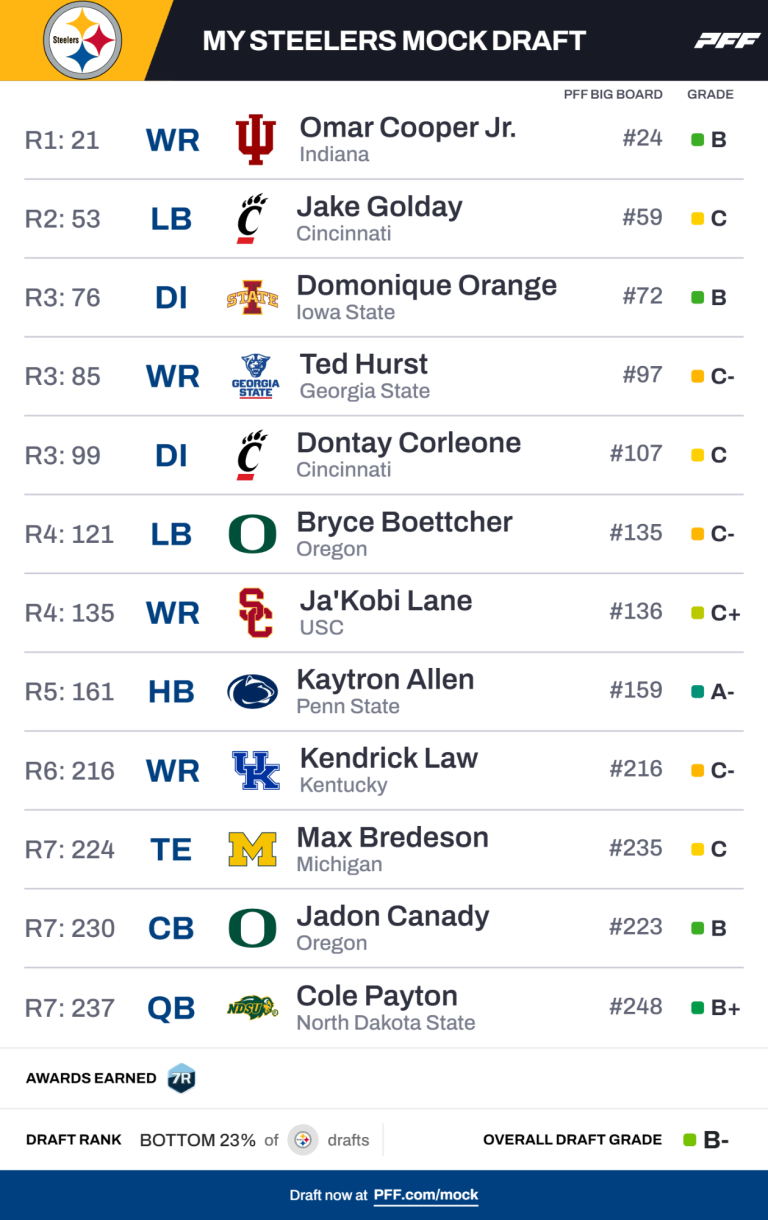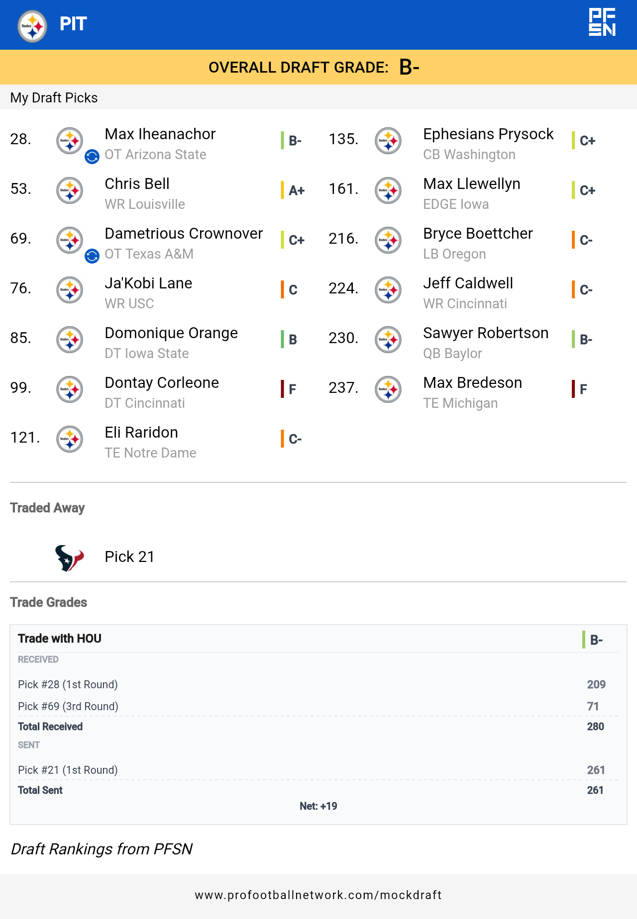 This class earns a B+ for its clear alignment with Mike McCarthy's priorities. The Steelers emphasized offensive line versatility and depth early, added future skill-position replacements at wide receiver, shored up the defensive front with high-character, scheme-specific players, and sprinkled in athletic depth on the edges and in the secondary. By trading down and maximizing mid-round selections, Pittsburgh avoided reaches while building a roster that can support a physical, balanced attack right away and evolve over the next few seasons. It's exactly the kind of disciplined, coach-friendly draft a first-year head coach needs to establish his culture in the Steel City.